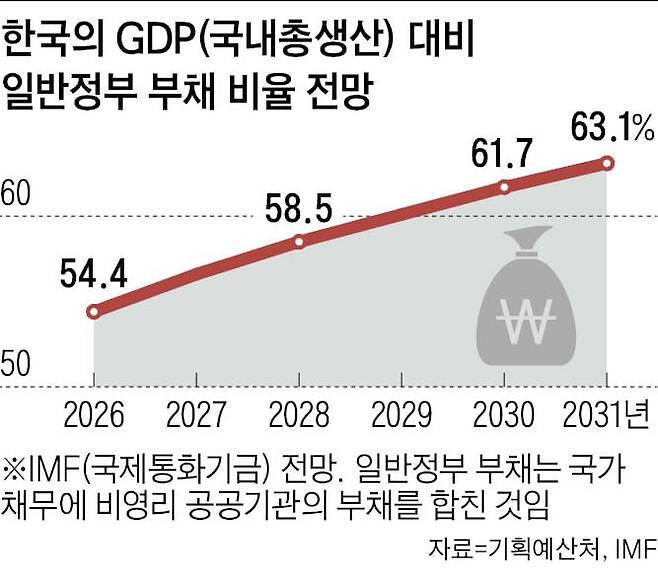 IMF 보고서에 따르면 한국의 GDP 대비 일반정부 부채 비율은 올해 54.4%에서 2031년 63.1%까지 치솟을 전망입니다.
