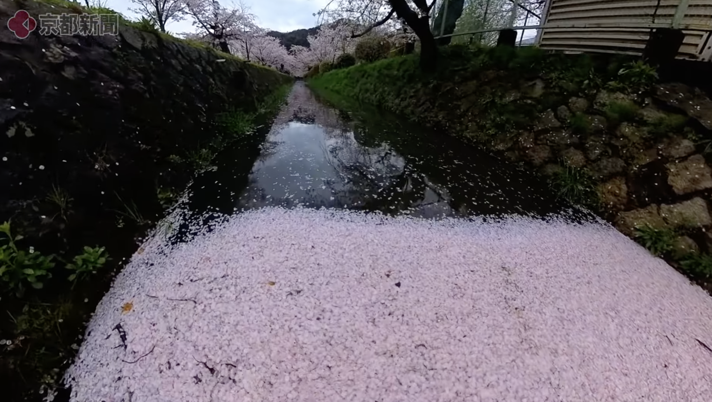 비가 오면 수로 위로 떨어진 벚꽃 잎들이 핑크색 띠를 이루며 흘러갑니다. 우산을 쓰고 이 길을 걷는 것은 맑은 날보다 훨씬 고즈넉하고 일본스러운 감성을 자아냅니다.