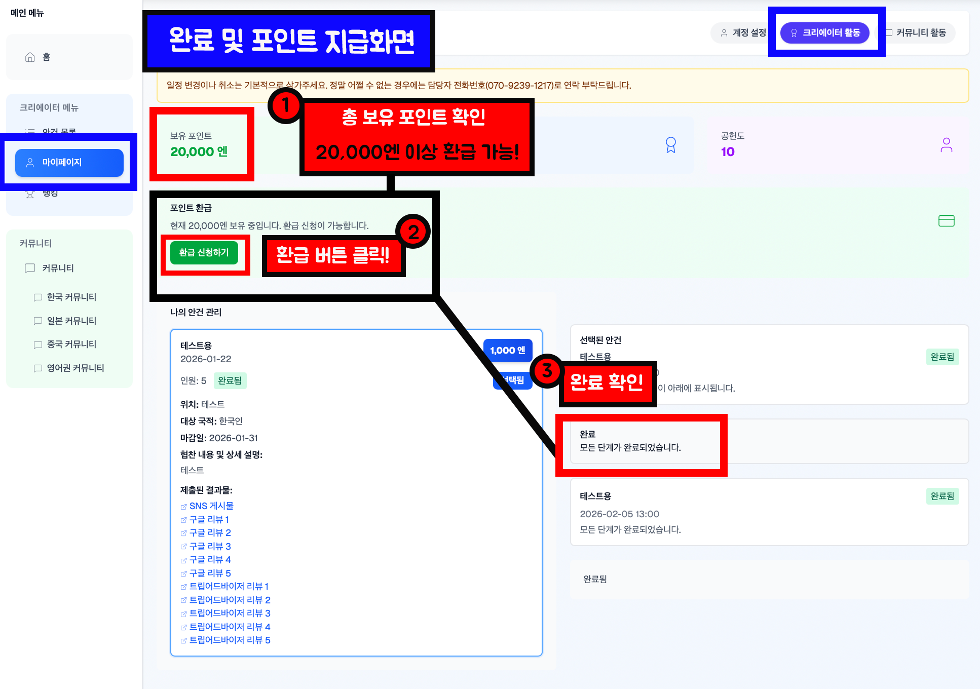 2) 완료 및 포인트 지급화면